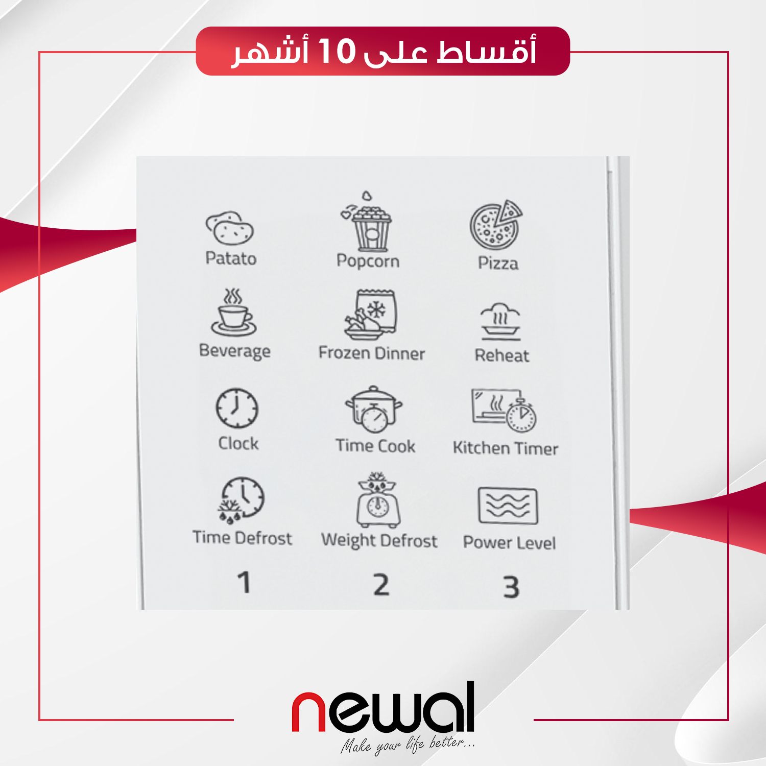 يعد مايكرويف Newal بسعة 20 لترًا الخيار الأمثل للمساحات الصغيرة أو للاستخدام الفردي والاحتياجات الأساسية. يتوفر هذا الحجم باللون الأبيض، ليضيف لمسة نظيفة إلى مطبخك مع الحفاظ على الأداء القوي.