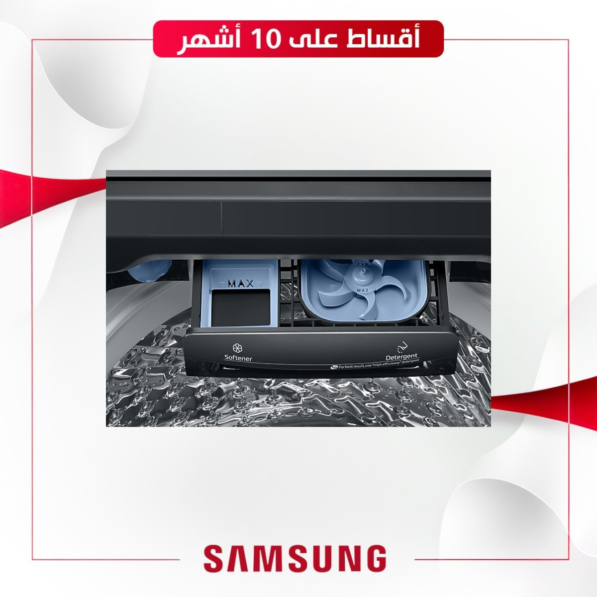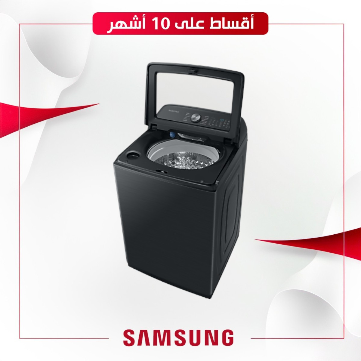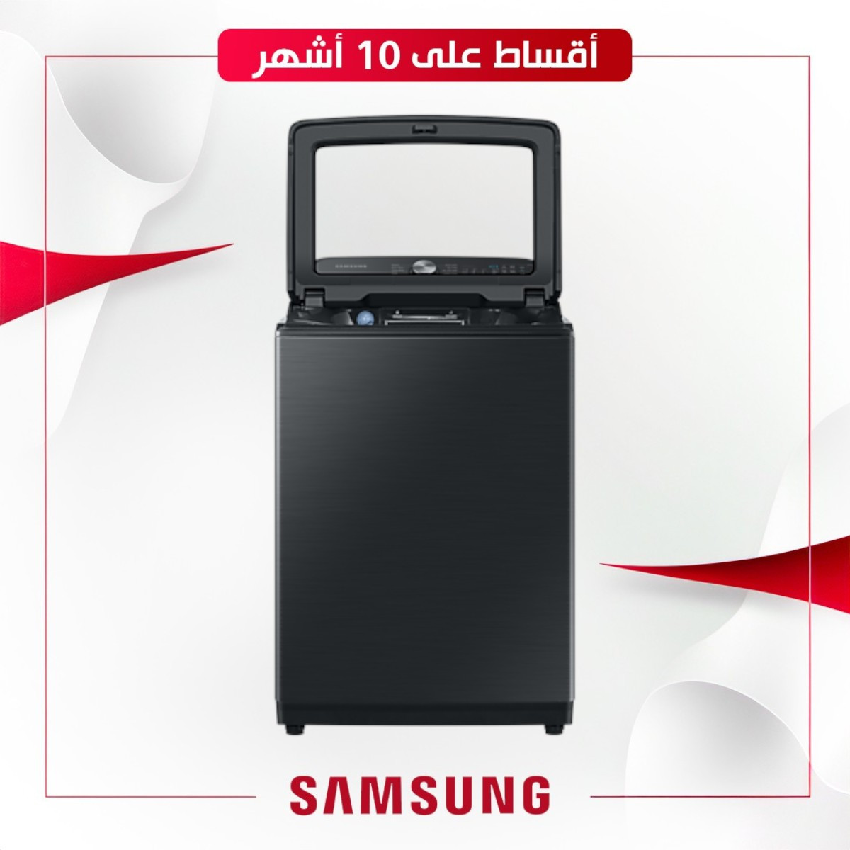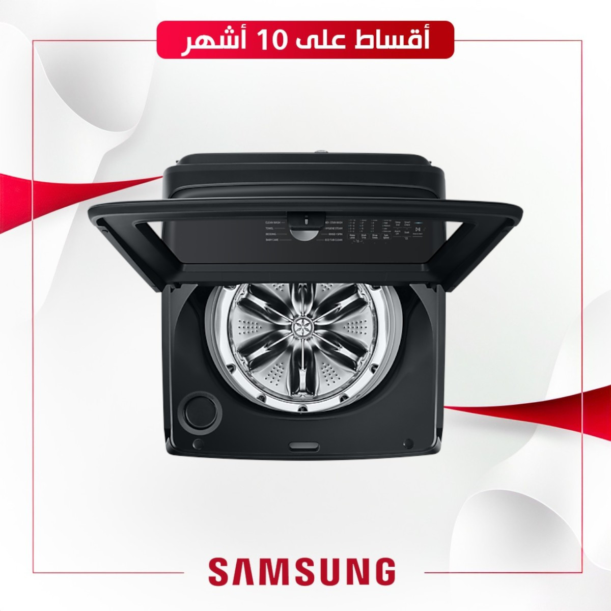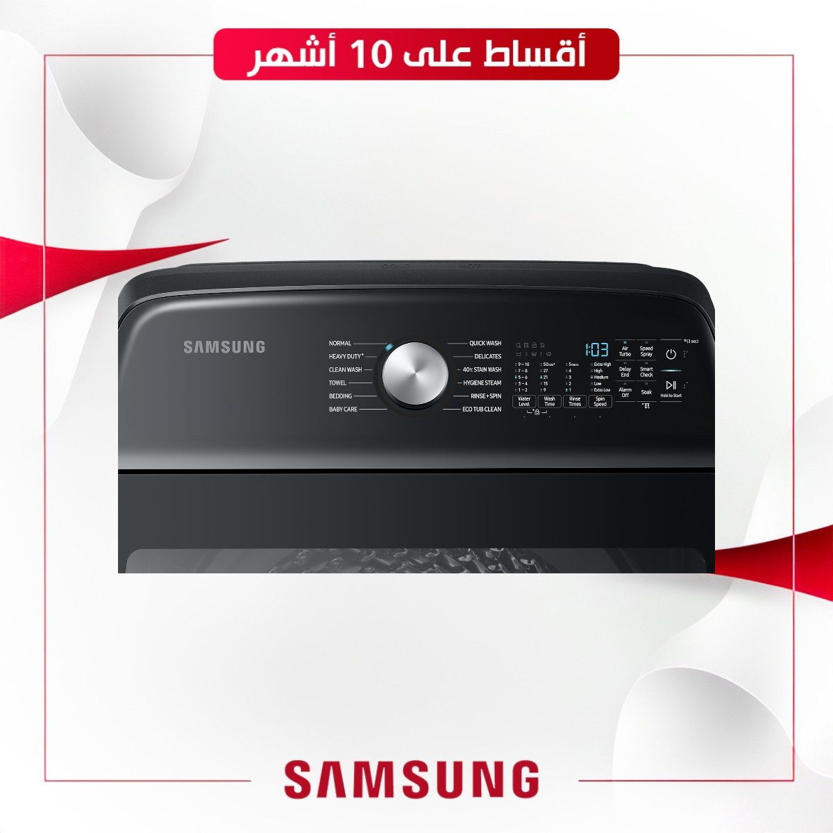 غسالة سامسونج WA22A8376GV بسعة 22 كيلوغرامًا، باللون الأسود، هي غسالة علوية متطورة تناسب الأسر الكبيرة أو الأشخاص الذين يحتاجون إلى معالجة كميات كبيرة من الملابس. إليك وصفًا لأبرز ميزاتها: